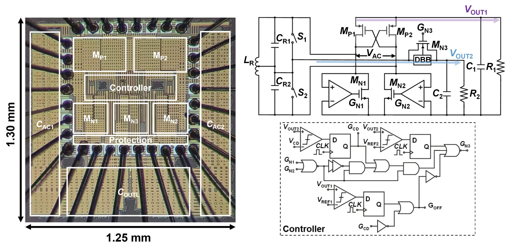 To conquer these limitations, the team proposed a novel single-stage dual-output rectifier chip topology, which can charge multiple outputs simultaneously within a half cycle. This significantly increases the load power and suppresses ripple voltage. Moreover, the team proposed an operation mode called charge distribution mode, which can address the usual challenge for voltage regulation during large load transient at the low-voltage output. By adaptively optimizing the charge distribution among multiple outputs, this mode effectively broadens the range of rated output current and significantly enhances the stability and adaptability of the circuit.