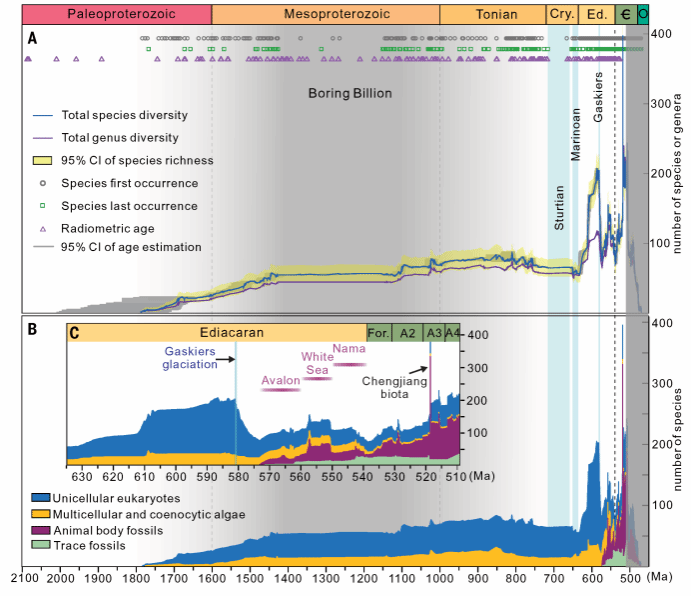Biodiversity trajectory of eukaryotic fossils from the Paleoproterozoic to early Cambrian.