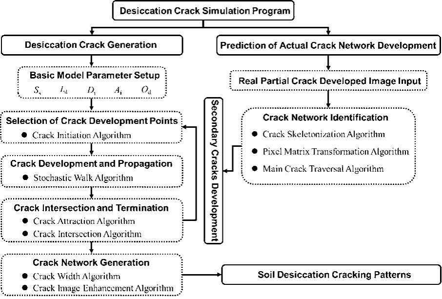 Recently, the research team led by Prof. Chaosheng Tang from the School of Earth Sciences and Engineering at Nanjing University has developed an innovative stochastic crack generation model for generating and predicting soil desiccation crack networks. By establishing a five-step simulation mechanism—comprising "crack initiation point selection, random path propagation, dynamic intersection judgment, secondary crack derivation, and crack network optimization"—the researchers achieved dynamic simulation of the full soil desiccation cracking lifecycle. A major innovation lies in its ability to predict future crack development and final network morphology based on partially formed cracks. This advancement offers strong theoretical and technical support for analyzing the engineering behavior of desiccated soils and mitigating drought-induced geohazards. The relevant research results were published in the journal Engineering Geology under the title " Generating and predicting soil desiccation cracking patterns utilizing a stochastic model based on geometric parameters."