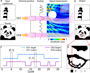 图2. 基于 Airy-Talbot 效应的高空间信息密度声通信示意图。(a) 两幅二进制图像(灯塔和熊猫,每幅图有 128×128 个像素点)分别通过两个信道(Ch1/Ch2)进行传输;(b) 由信道中Airy束携带的接收数据独立检索图像;(c) 目标输出和实际输出信号间的比较;(d) 图(b)中红色方框区域的放大视图。