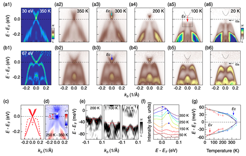 基于以上背景,张鹏课题组及合作者针对准一维材料Ta2Pd3Te5展开了详细的研究。对该材料的电阻测量结果表明在350K-360K其电阻存在半导体-金属行为的突变,同时电子衍射实验表明在330K附近具有微弱的晶格畸变,这表明Ta2Pd3Te5在该温度区间可能存在电子结构的变化(图1)。基于同步辐射光源的ARPES实验显示,Ta2Pd3Te5单晶材料在350K温度G点附近具有狄拉克型能带,其狄拉克点恰好位于费米能,是一种理想的狄拉克半金属态,这种半金属态非常有利于激子绝缘体态的形成。随着温度降低,在费米能级附近观测到能隙的打开,在20K下能隙约为100meV,在350K该能隙关闭,能隙的温度演化行为与激子相符(图2)。同时,在具有相同晶格结构的Ta2Ni3Te5半导体材料中并没有观察到类似的能隙演化行为,表明该能隙与Ta2Pd3Te5的狄拉克半金属能带结构密切相关。