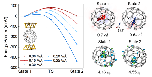 通过DFT计算进一步验证了电控单原子磁性切换的物理机制(图2)。受电场调控,Dy可以在空间中的两个可能位置中的任何一个,这不仅影响了电偶极子的方向和大小(从0.70 e?转变为0.64 e?),也影响了Dy周围的配位,使得磁矩有所不同(从4.16 ?B转变为4.55 ?B),从而实现单