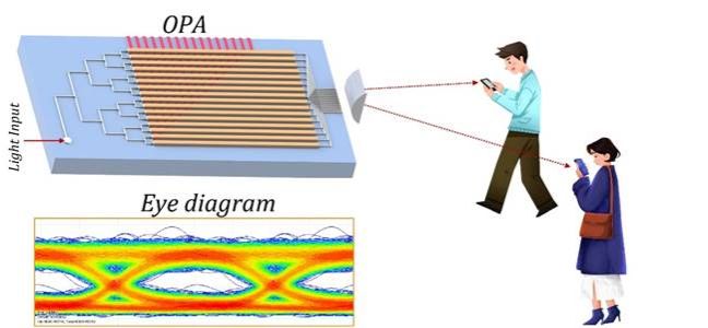 图1 使用光学相控阵支持面向多个移动用户的无线光通信,实现用户间快速切换的示意图。下方为实验接收到的12Gbps信号眼图。