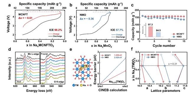 (a) P2-Na0.67Mn0.6Cu0.08Ni0.09Fe0.18Ti0.05O2 和(b) P2-Na0.67MnO2 首圈充放电曲线示意图;(c) 10 mA g-1电流密度下循环性能对比图;(d) 线扫EELS测试图;(e) Na+迁移势垒对比图;(f) 不同Na含量晶胞参数对比图。