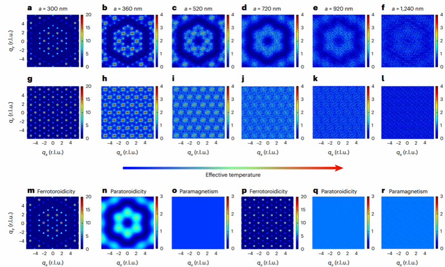 图5. 磁结构因子可视化铁涡相变。(a-f)不同晶格常数下自旋结构因子图;(g-l)不同晶格常数下铁涡矩结构因子图;(m-o)理论上三种物相下的自旋结构因子图;(p-r)理论上三种物相下的铁涡矩结构因子图。