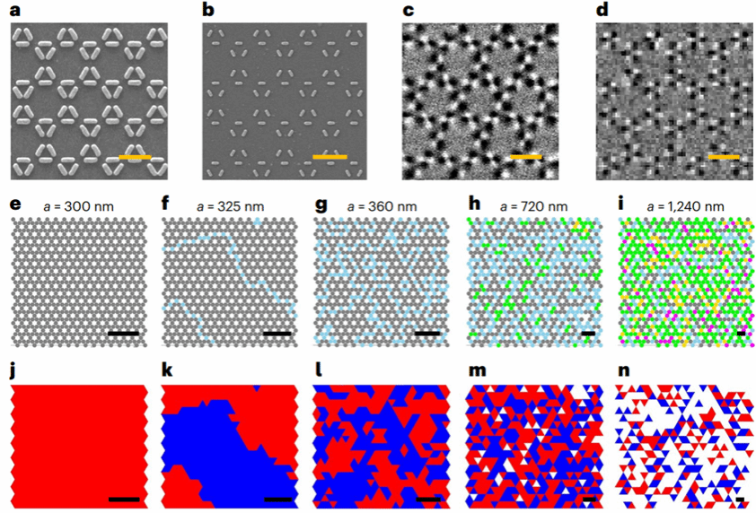 图4. 铁涡相变的直接成像。(a-b)晶格常数为360 nm和720 nm样品的扫描电子显微镜图像;(c-d)晶格常数为360 nm和720 nm样品的磁力显微镜图像;(e-i)不同晶格常数下的自旋/顶点类型分布图;(j-n)不同晶格常数下两种极性铁涡矩的分布图。