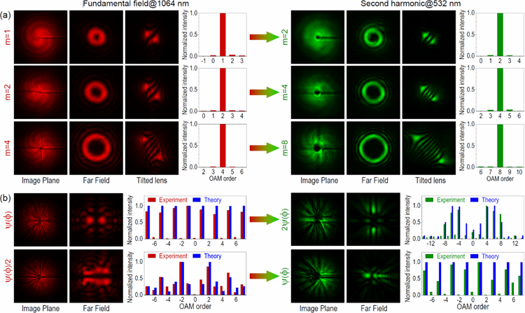 与腔外相比,数字激光器支持的腔内结构光提供了数量级增强的能量密度,为开展腔增强结构光与物质的相互作用带来了新的契机。以二次谐波产生为例,如图4所示,研究人员在腔内放置LBO晶体,成功实现了单涡旋激光及OAM梳的腔增强倍频;在相同的泵浦条件下,相比于腔外倍频,非线性转换效率提升了340余倍。激光谐振腔增强的空间结构光非线性过程未来有望在不易直接相位调控的波段,用于空间结构光的生成。