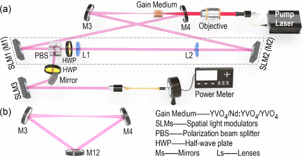 其次,研究人员提出了一种新颖的嵌套环形腔结构,如图2(a)所示:在该“8”字环形腔中,有一对加载共轭多涡旋相位图的SLM和一个嵌入的4f系统构成的简并腔;其中虚线框所示的部分可以等效为一个腔镜M12,这样“8”字形的环形腔简化为一个由M12、M3和M4构成的稳定三镜环形腔,如图2(b)所示。一个稳定谐振腔通常将以高斯模式振荡,因此在M4-M1路径中振荡的高斯模式由SLM1被转化为携带有预设相位的结构激光模式,然后经4f系统成像在携带共轭预设相位的SLM2上,最后在M2-M3路径中被再次恢复到高斯模式。由于嵌入的简并腔可以支持任意相位编码模式,突破了常规稳定环形腔的横模限制;另一方面, 在“8”字环形腔的其它路径上仍然以基模高斯振荡,相比于高阶模式激光,具有很高的稳定性。当在简并腔中插入一个偏振分束器,便可从腔中提取预设的结构激光模式输出。这一新颖激光器设计,既克服了简并腔空间相干性较差的问题,又解决了非简并腔模式竞争的问题,结合可编程的空间光调制器,实现了灵活、高相干性、可任意相位编码的空间结构光数字激光器。如图3所示,研究人员利用该激光器输出了高达64梳齿数的OAM梳激光。