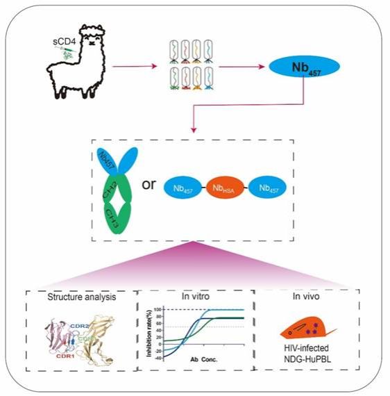 近日,凯发k8官网医学院吴稚伟、吴喜林的课题组在这一领域取得了重要突破。基于课题组原创性的纳米抗体发现和工程改造平台,他们通过羊驼免疫和高通量噬菌体展示技术,成功从羊驼体内分离出一系列CD4纳米抗体。其中,Nb457在治疗HIV感染方面展现出巨大潜力,在检测的代表全球117株HIV假病毒里,只有一株病毒不能抑制,广谱性为99.1%,抗病毒活性为pM级,Nb457纳米抗体的广谱性和抗病毒活性明显优于现有的HIV中和抗体。