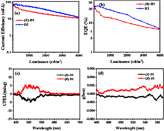 以两种手性分子为掺杂制备的CP-OLED((R/S)-D1)和OLED(D2)器件表现出良好的综合性能,启动电压为3.2 V,最大电流效率为72.4 cd/A,EQEmax高达37.0%,在所报道的CP-OLED器件中是最近性能之一(图4)。同时,(R/S)-D1器件显示了对称的CPEL光谱,|gEL|因子为0.61 × 10-3,并且在器件制备过程中(R/S)-4-POtBuCzB显示了出色的构型稳定性,没有发生消旋。