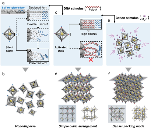 DNA作为一种优异的自组装材料在指导纳米颗粒的精确和可编程组装方面被广泛探究。其中,一元体系是理论上进行自组装的最简洁设计。这种各向同性的设计允许溶液中的所有构建块以相等的可能性结合,同时也简化了在外部刺激下基本单元组装行为的调节过程。然而,因为单体合成过程很难与组装过程严格解耦,从而导致对组装的不精准控制,所以一元体系很少被采用。