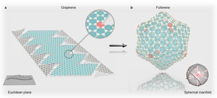 图1:平面石墨烯通过切割粘合形成富勒烯球体示意图。