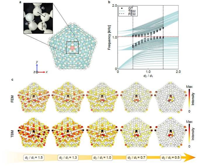如图1所示,研究团队通过切割和重新拼接二维平面石墨烯,引入多个五边形位错缺陷,形成了三维富勒烯球体结构。结构中的周期性破缺和重新拼接形成了等效规范场。基于规范场理论的计算,预测在拓扑非平庸系统中,局域于五边形处的近零能拓扑保护缺陷态数目为六个。团队利用空气腔体管道结构构建了这一声学等效模型,设计并制造了这种复杂的闭笼状球形声学类富勒烯C540(如图2a所示)。该结构由12个五边形和260个六边形组成。