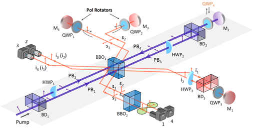 图2:基于路径全同性原理产生纠缠的实验设置。探测器从路径1,4上收集到一对纠缠态,使用绿色标记表示。这两条路径中的粒子之间无直接相互作用。
