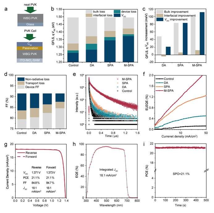 图3. 宽带隙钙钛矿太阳能电池的性能。a, 钙钛矿薄膜和器件结构的PLQY测量示意图。b, 从钙钛矿薄膜和器件的PL光谱中提取的QFLS和Voc值。c, 与对照样品相比,不同宽带隙钙钛矿的QFLS和Voc。d, 比较不同电池的损失机制分布。e, 在从钙钛矿侧激发时,对照、DA、SPA和M-SPA钙钛矿薄膜的TRPL衰减曲线。f, 不同工艺的器件的EL-EQE。g, 最佳M-SPA器件的J-V曲线。h-i, M-SPA方法制备的最佳性能宽带隙钙钛矿太阳能电池的EQE (h)和MPP跟踪(i)。