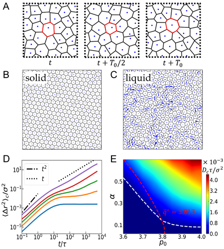 图 1:(A)脉动细胞组织模型。(B)(C)固态和液态的模拟快照,蓝色箭头表示细胞经历一个脉动周期的位移。(D)均方位移ΜSD与脉动幅度α的关系(脉动幅度从下到上增加)。(E)扩散系数Dc随形状因子p0和脉动幅度α变化的相图。