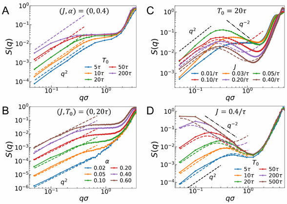 图 3:(A)(B)随机脉动情况下,静态结构因子与脉动周期Τ0(A)和脉动幅度α(B)的关系。(C)静态结构因子与脉动耦合强度J的关系。(D)同步脉动情况下,静态结构因子与脉动周期Τ0的关系。