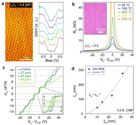图3. 单面氢化石墨烯的性质分析。(a)STM和STS测量显示石墨烯表面不存在氢原子,同时存在~300 meV的能隙。(b)不同温度时加氢的氢化石墨烯(氢化程度相同,空间分布不同),电阻随电场的变化,单面氢化呈现出更高的电阻值。(c)不同H/C比的单面氢化石墨烯,其霍尔电导随电场的变化,当H/C比增加时,量子霍尔平台逐渐偏离。(d)相干长度(Lφ)与氢原子平均间距(LH)的关系。