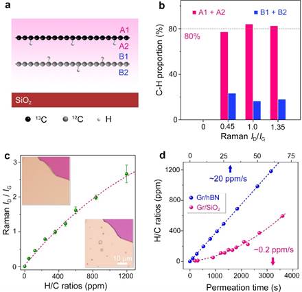为了精确量化H/C原子比,他们利用13C和12C同位素的单层石墨烯,叠层转移出双层石墨烯(13C/12C)和三层石墨烯(13C/13C/12C)。通过不同时间的加氢反应并结合13C和12C的拉曼特征峰强度比值,测定出了质子穿透石墨烯的深度(最多三层)和插层氢原子用于单面氢化的利用率(约80%)。最终,他们基于质子渗透速率,渗透时间和渗透质子的利用率,定量计算出了单面氢化石墨烯的H/C比。通过对比不同限域空间体系,他们发现放置在hBN上石墨烯的加氢速率高达20 ppm/s,比较传统放在硅片上石墨烯提升了两个数量级(图2)。