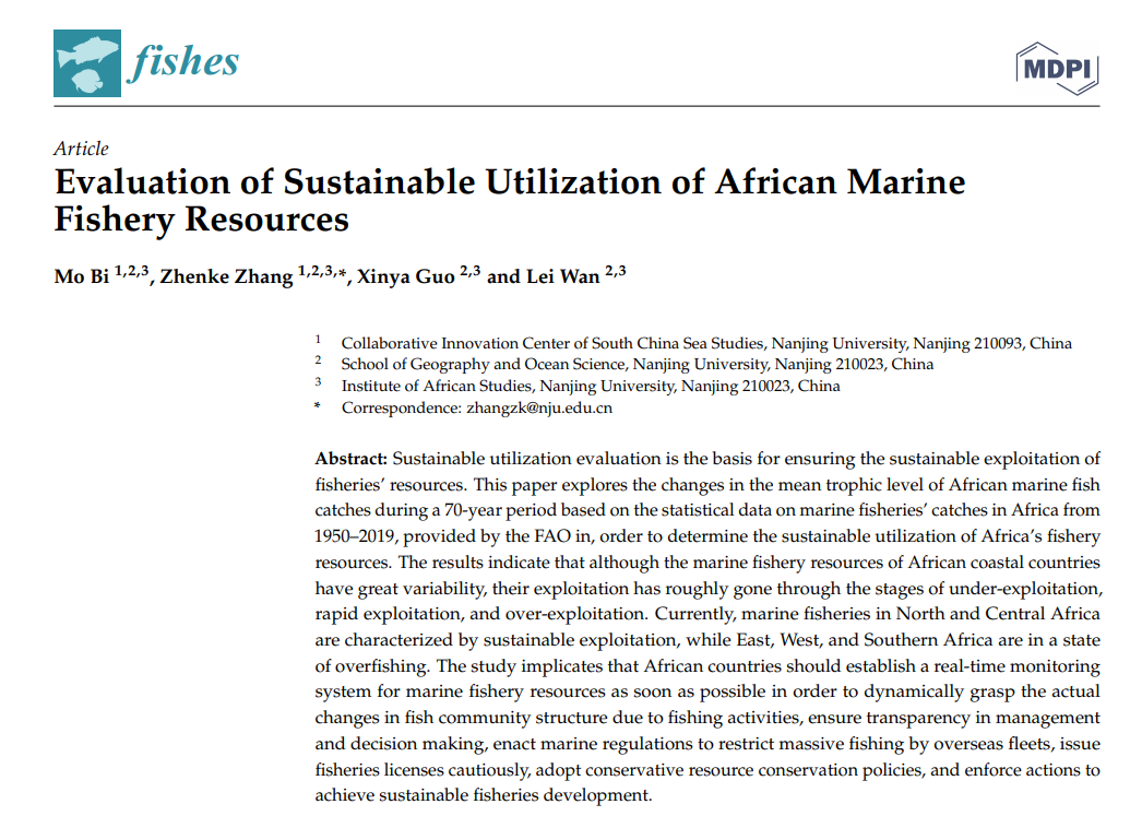 非洲有38个沿海国家和岛屿国家,海洋渔业在非洲沿海国家经济社会发展中具有重要地位。博士生毕墨以第一作者在Fishes期刊发表Evaluation of Sustainable Utilization of African Marine Fishery Resources,在分析非洲海洋渔业资源开发现状的基础上,对海洋渔业资源的可持续利用进行评价。
