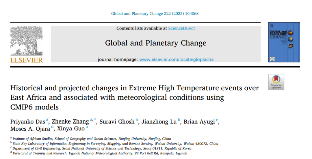 1. Priyanko Das,Zhenke Zhang*,Suravi Ghosh,et al. Historical and projected changes in Extreme High Temperature events over East Africa and associated with meteorological conditions using CMIP6 models. Global and Planetary Change,2023, 222 : 104068. https://doi.org/10.1016/j.gloplacha.2023.104068