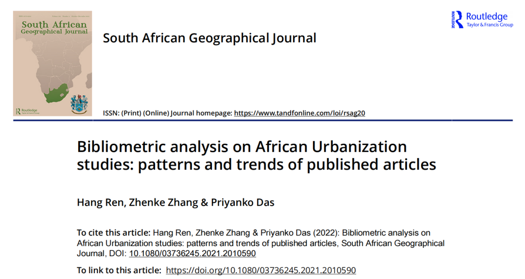 3. Hang Ren, Zhenke Zhang*, Priyanko Das. Bibliometric analysis on African Urbanization studies: patterns and trends of published articles. South African Geographical Journal, 2023, 105(1):54-74. https://doi.org/10.1080/03736245.2021.2010590